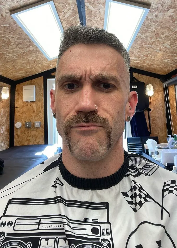 A Fu Manchu Mustache consists of a full, thick mustache that grows across your upper lip and then extends downward at the ends, sometimes reaching or passing the lower lip. The key distinction is that this style stands alone—there’s no beard accompanying it, which makes the Fu Manchu Mustache particularly striking and unmistakable.