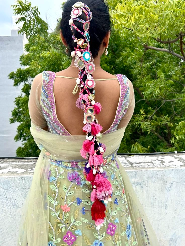 Think bohemian side braids with subtle thread work, messy braids with colorful accents, or even incorporating the paranda into ponytails instead of traditional braids. It’s all about making it feel current and Instagram-worthy!