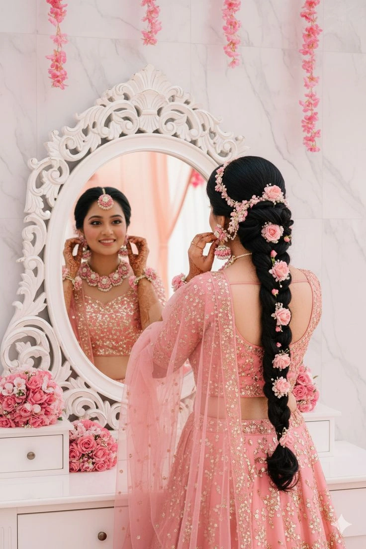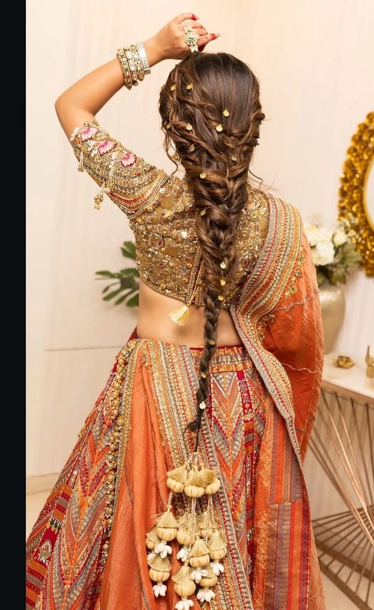 The paranda hairstyle for lehenga works because it creates that perfect balance. Your outfit gets to shine, your hair looks incredible, and you’re not drowning in too much embellishment.